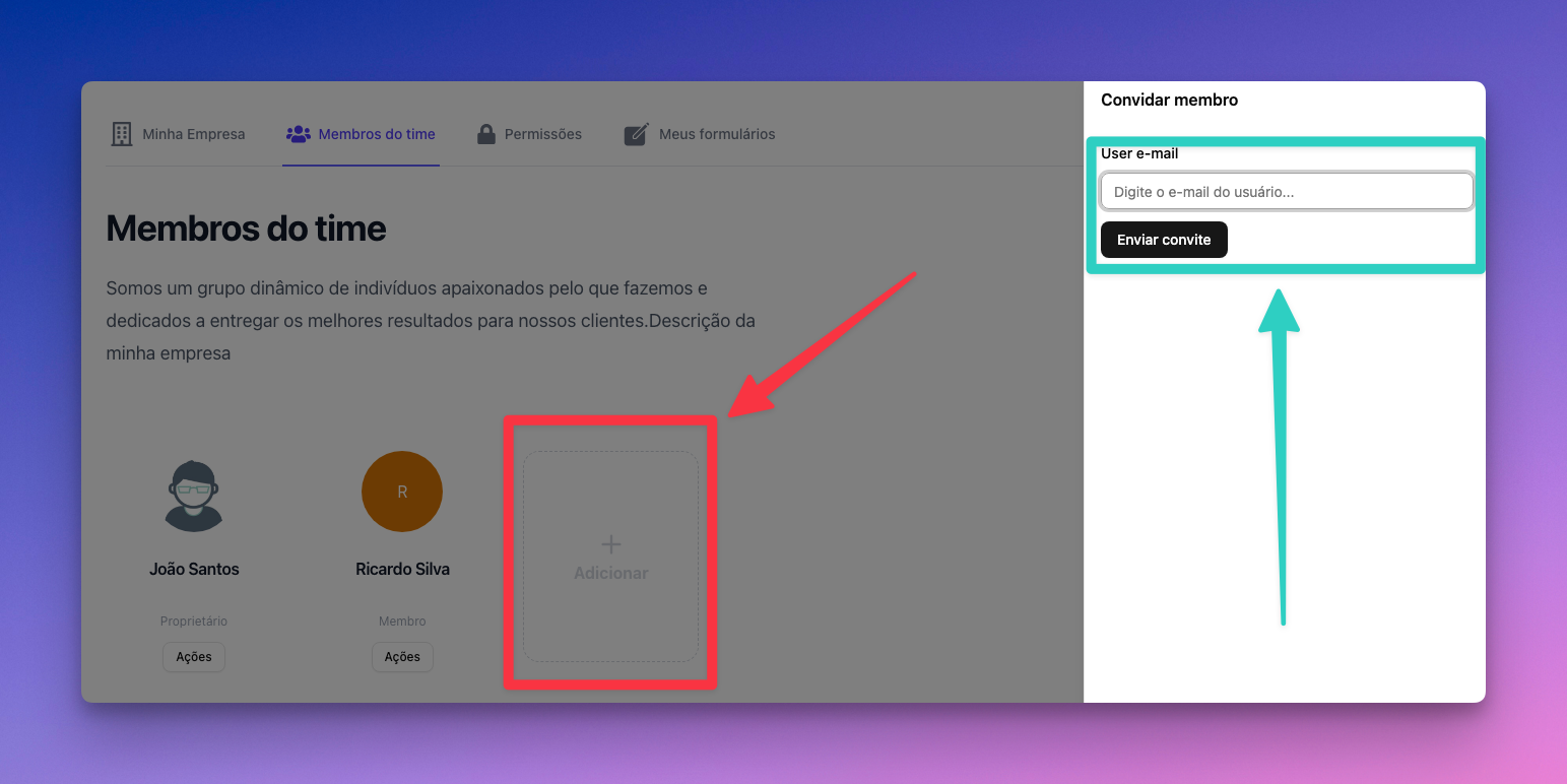 Clique no botão “Adicionar” e coloque o e-mail do membro que será adicionado na empresa.