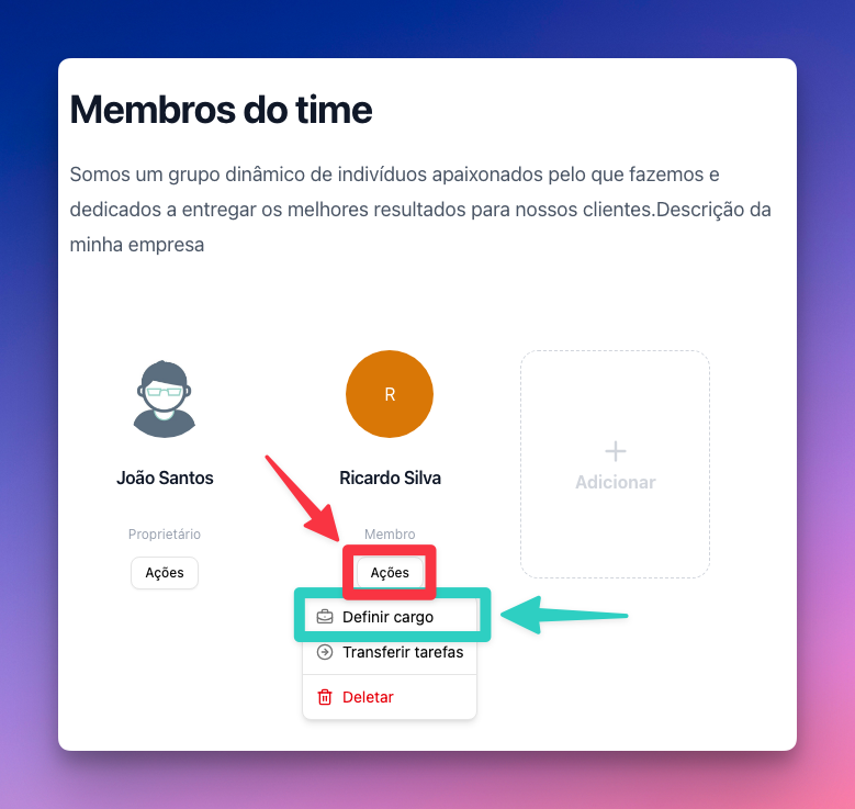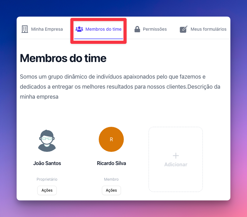 Nesta tela, você conseguirá adicionar, promover e remover os membros da sua empresa.