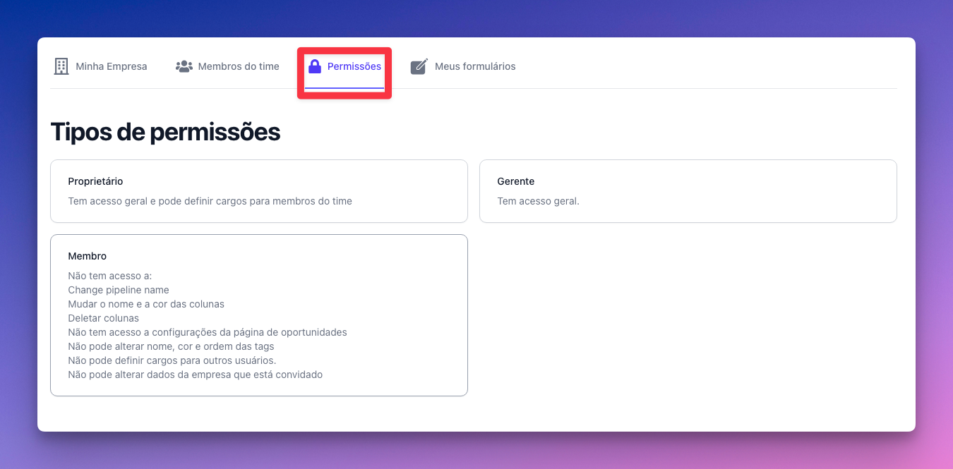 A aba de permissões serve como uma página que informa o que cada cargo fornece ao usuário.